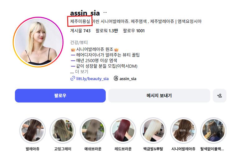 보내주신 레퍼런스 계정을 보면 소개 첫 줄에 '제주미용실'이라는 걸 명시하고 있어요. 이게 필요합니다.