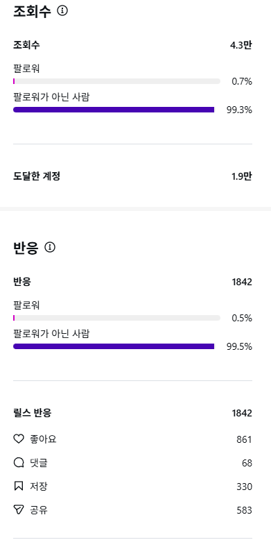 단톡에서도 질문드렸던 것인데, 릴스는 올리자마자 팔로워가 아닌 사람들에게 알고리즘이 노출을 시켜주는 느낌.