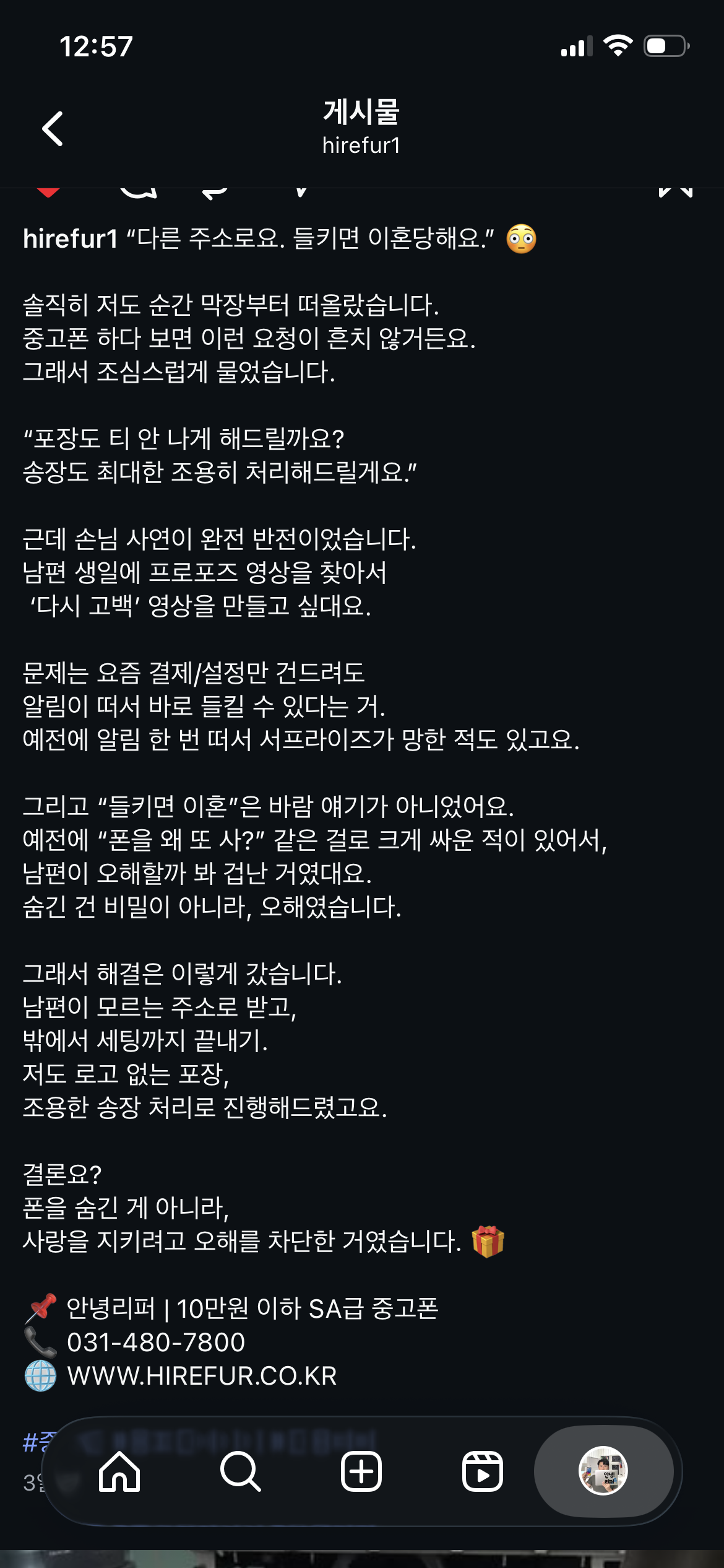 민영님 피드백 드립니다~! 수고하셨어요 ㅎㅎ 1. 카피 보완 지금 형식이 살짝 아쉬운게, 카피가 정보가 많게 느껴지고 길어요! 문장이 2개로 쪼개져서 그렇습니다. 한줄카피로 가야해요. 그리고 고객이 사장님한테 물어보는 듯한 느낌이 덜한데, 레퍼런스처럼 사장님을 붙이거나 혹은 아래 레퍼처럼 가도 좋아요 https://www.instagram.com/reel/DPVgB6lkeH7/ ex. - 사장님, 이거 그냥 몰래 하나 더 개통하면 안 되나요? - “사장님… 이거 와이프한테는 알림 안 가죠?” - 사장님... 이거 아내가 알면 진짜 큰일 나요 이런식으로 워딩을 '사장님'을 붙이고 가거나, 레퍼런스처럼 사연형 카피 + 나레이션 구조로 가보면 좋을 것 같아요 2. 레퍼런스는 ‘전문가 해결 구조’, 민영님은 ‘사연 위주’입니다 https://www.instagram.com/reel/DPVgB6lkeH7/ 위 링크가 훨씬 레퍼런스에 가까우신 것 같아서 이 기준으로 말씀드릴게요! 아직 안 보셨으면 강의에도 있으니 분석이랑 같이 들어주세요! 레퍼런스는 - 이상한 요청 발생 - 왜 그런지 질문 - 전문가의 해결책 제시(듀얼번호) - 비용·편의성 개선이라는 명확한 결과 이 흐름이 아주 선명합니다. 그래서 이 릴스는 사연 콘텐츠이면서 동시에 정보 콘텐츠로 작동합니다. 반면 민영님 릴스는 사연의 반전은 좋지만, “그래서 이 매장은 뭐가 다른데?”라는 질문에 대한 답이 약합니다. 문제 해결이 ‘조용한 포장 + 다른 주소 배송’으로 끝나면서 전문성보다 사연 미담으로 기억될 가능성이 큽니다. ex. 사연 → 공감 → “그래서 우리는 이렇게 해결합니다”를 한 문장으로 더 명확히 정리하세요. - “이런 오해 상황, 보통은 이렇게 해결합니다” - “몰래가 아니라, 오해를 줄이는 방법이 있습니다” 3. 결론 메시지가 ‘매장 철학’까지는 못 갑니다 레퍼런스는 마지막에 “한 분이라도 제대로 도와드리자” 라는 명확한 매장 철학을 남깁니다. 그래서 시청자는 이 매장을 “믿을 수 있는 곳”으로 인식하게 됩니다. 민영님 릴스의 결론 “사랑을 지키려고 오해를 차단한 거였습니다” 감동은 있지만, 매장의 기준·원칙·차별성은 남지 않습니다. 그래서 보고 나서 “좋은 이야기네”에서 끝나기 쉽습니다. ex. - “저희는 몰래를 돕지 않고, 오해를 줄여드립니다” - “판매보다 상황을 먼저 봅니다” - “사연보다 중요한 건, 가장 안전한 해결입니다”