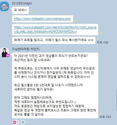 제가 계정이 여러개가 있는데, 피드백 받을때 현재 계정에서 올리는 링크들은 분명히 해당 영상의 링크를 복사하여 올리는데도 불구하고 클릭하면 계속해서 전혀 상관없는 피드가 뜨고있습니다.