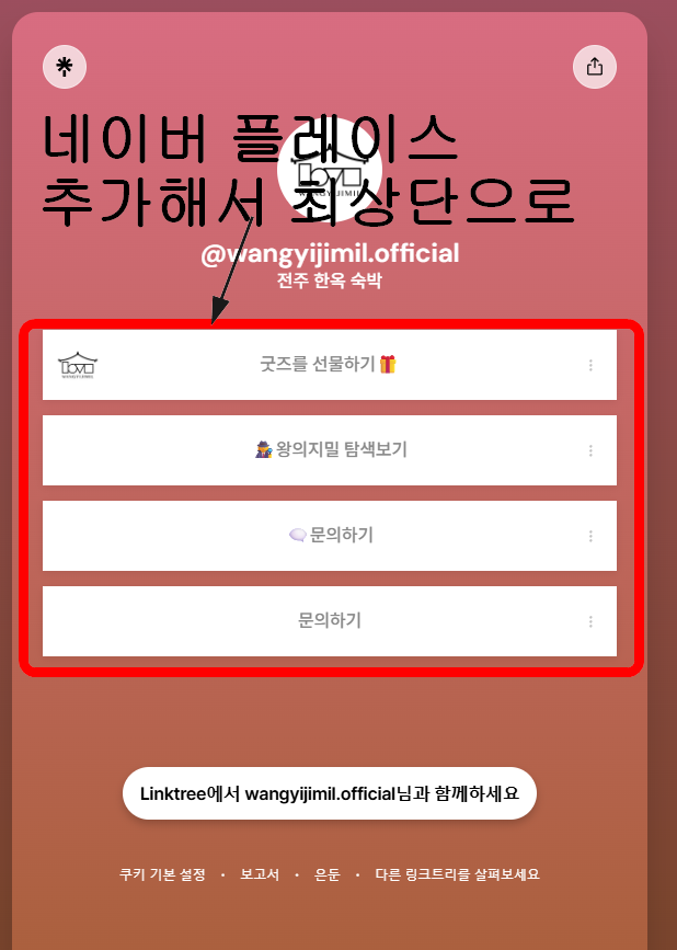 현재 링크트리에 굿즈 선물, 왕의지밀 탐색보기, 문의하기 이렇게 3개 섹션이 있는데요~